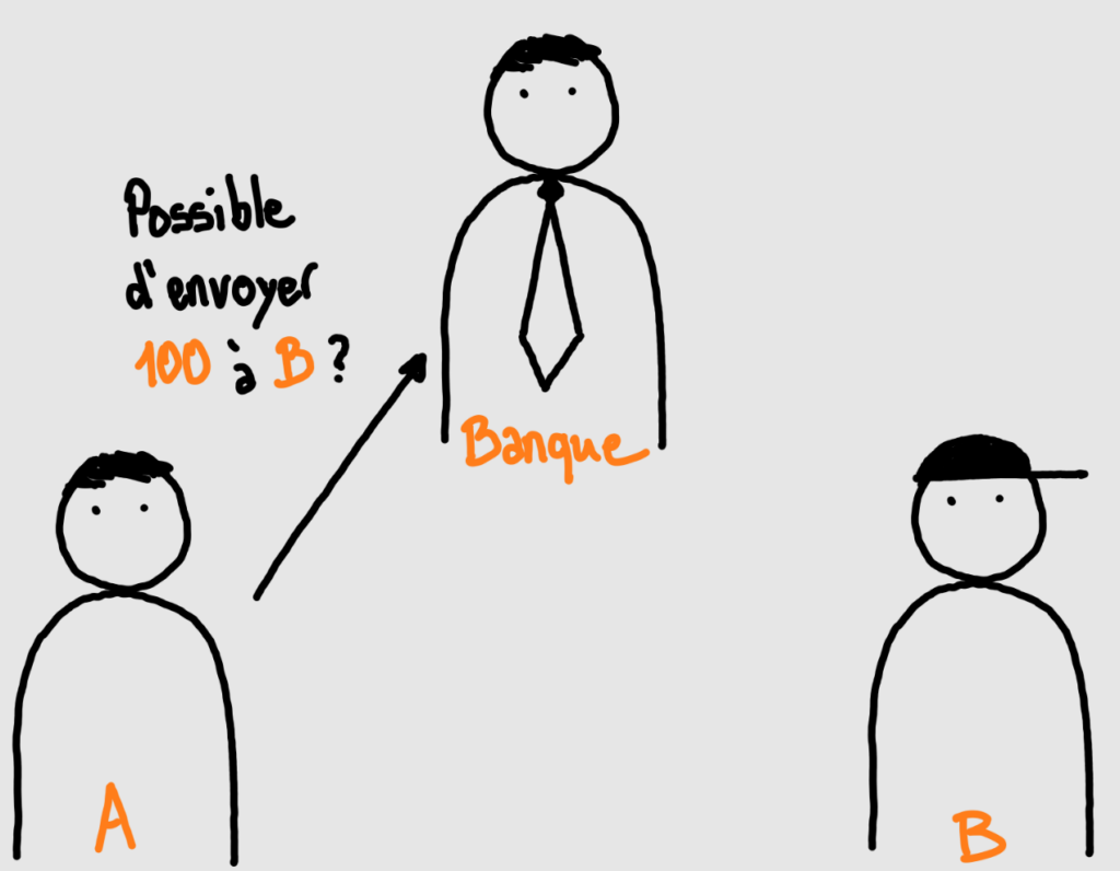 Une banque sert à plusieurs choses, dont gérer des flux et des avoirs financiers. Si A veut envoyer 100chf à B, il annonce à la banque la transaction. La banque vérifie que A a l’argent suffisant sur son compte, supprime la somme de 100chf des avoirs de A pour les ajouter aux avoir de B.