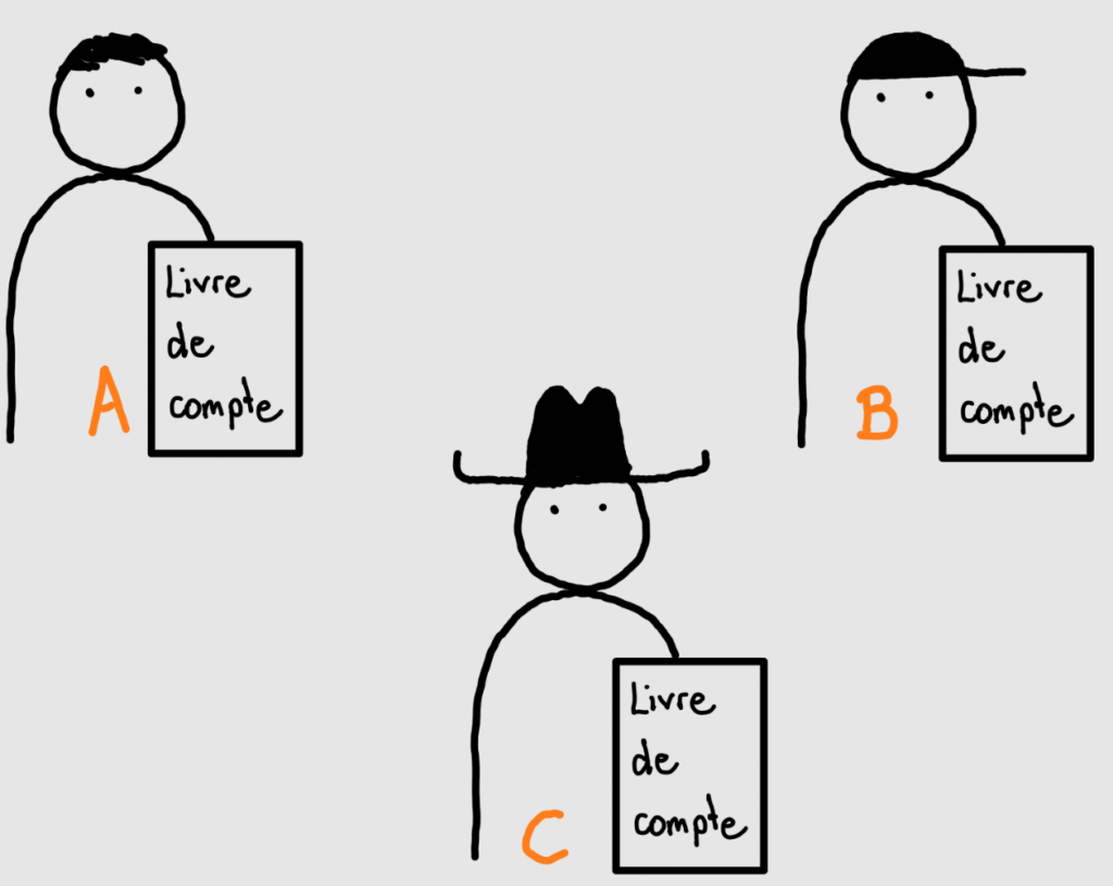 L’idée est donc que le livre de compte soit tenu par tout le monde. C’est le principe de décentralisation. Chacun peut tenir un copie du livre de compte et plus il y a de copie plus le réseau est sécurisé.