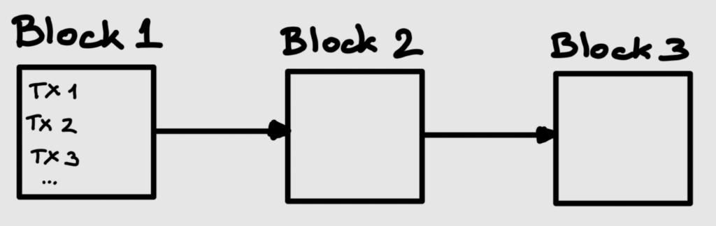On aura donc pu le deviner, une blockchain est une chaîne de blocs. Ces blocs (virtuels) sont entre autre constitués d’une liste de transactions (TX) qui ont été faites sur le réseau.