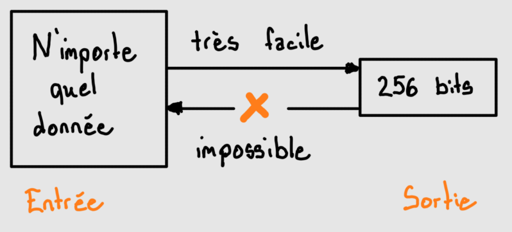 On peut mettre n’importe quelle type de donnée en entrée, de n’importe quelle longueur et de n’importe quel type (chiffres, lettres, caractères spéciaux, …). Dans le cadre de la fonction cryptographique utilisé pour Bitcoin, on obtiendra en sortie toujours une chaîne de caractère de longueur de 256 bits.
