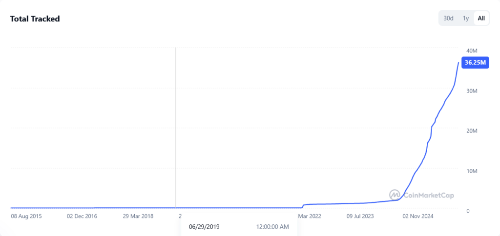Le graphique ci-dessus montre le nombre de cryptomonnaies différentes, monitorées par CoinMarketCap. On observe, fin 2024, une explosion non négligeable des cryptomonnaies suivies par le site.