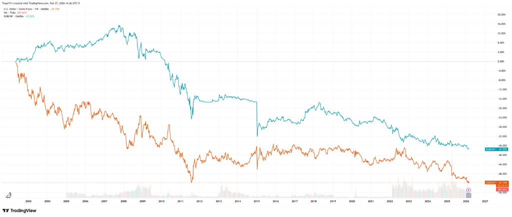 Le CHF est une des monnaies fiat avec la meilleure réputation au monde. La confiance forte vis-à-vis du CHF lui donne un statut de monnaie refuge, car parmi les autres monnaies fiat, c’est une réserve de valeur relative qui est très appréciée en période de crise. C’est une monnaie avec une discipline monétaire plus grande sur le long terme que bien d’autre monnaie fiat.